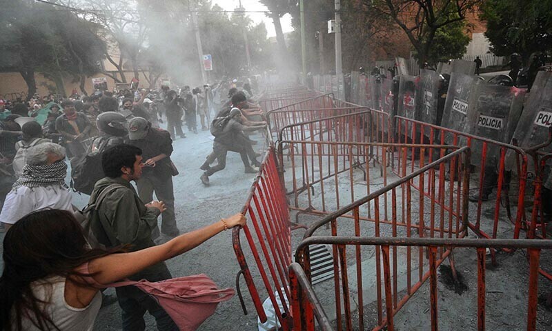 Some protesters covered their faces and threw stones at riot police, who blocked their path to the diplomatic complex in the city’s Lomas de Chapultepec neighbourhood.